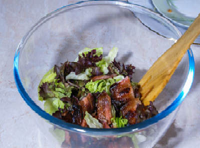 Достаем салатник, солим, добавляем растительное масло, бекон и перемешиваем.
